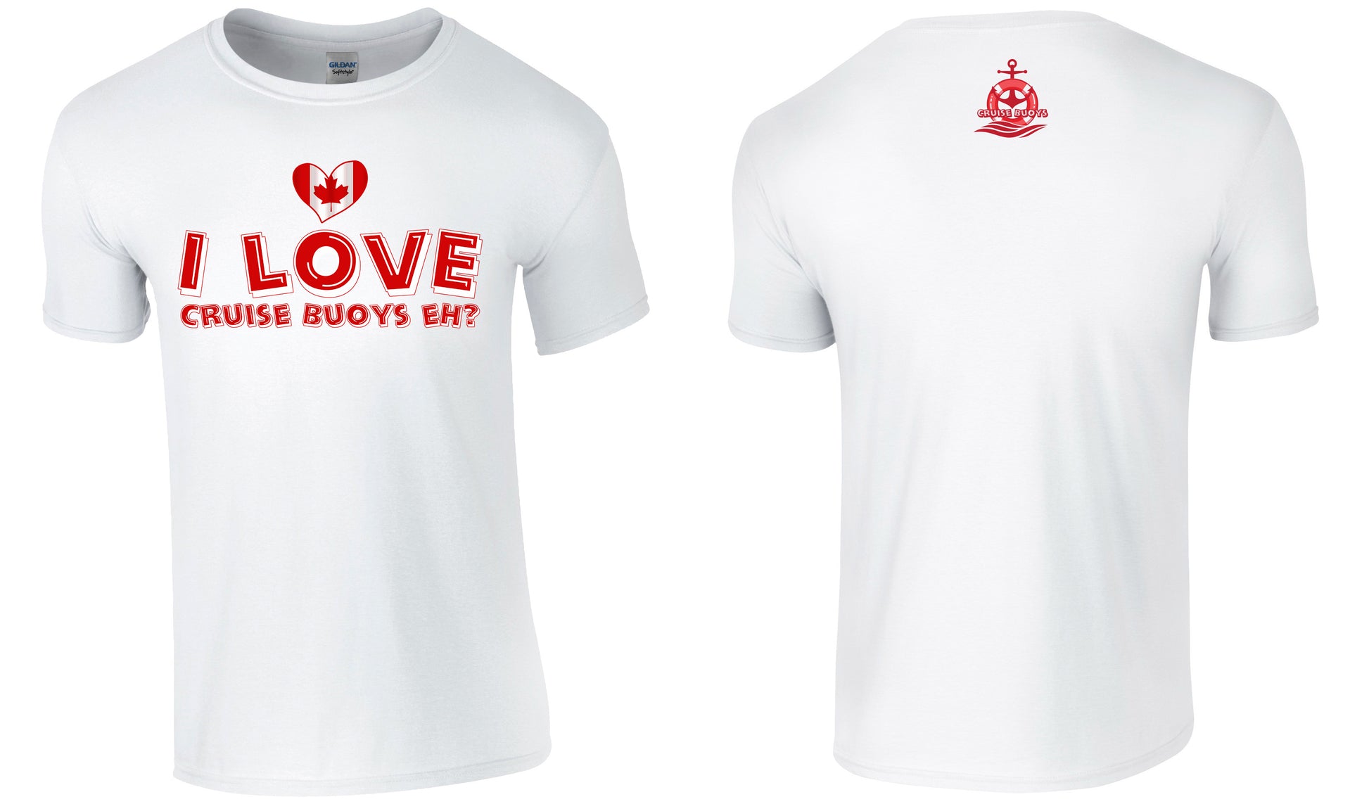 Unisex white T-Shirt with I Love Cruise Buoys Eh? logo to the front.