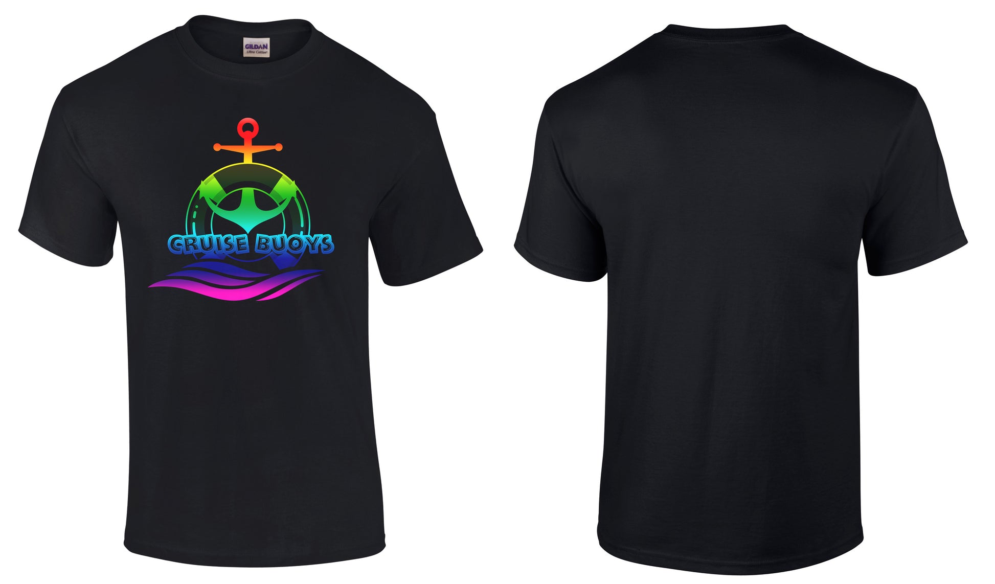 Unisex black T-Shirt with large rainbow Cruise Buoys logo to the front.